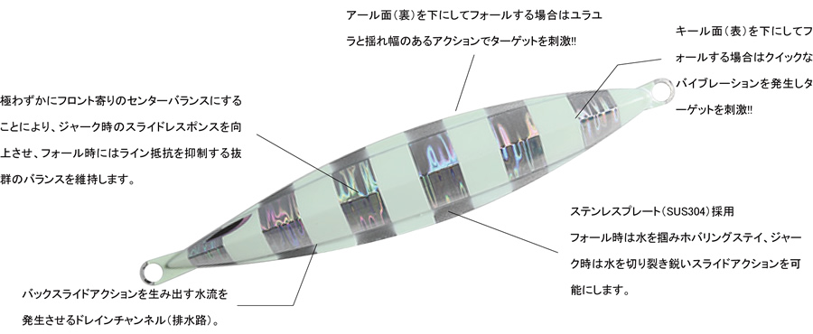 ※本製品は極めて薄いステンレスプレートを使用しているため、衝撃や大きな力が加わると変形・破損・破断の恐れがあります。しかし、強度よりも釣果優先としているため、ご使用に関してはご理解の上でよろしくお願いいたします。