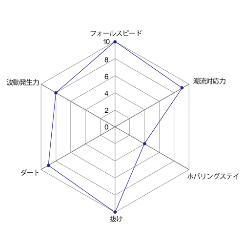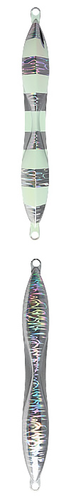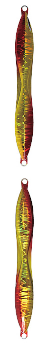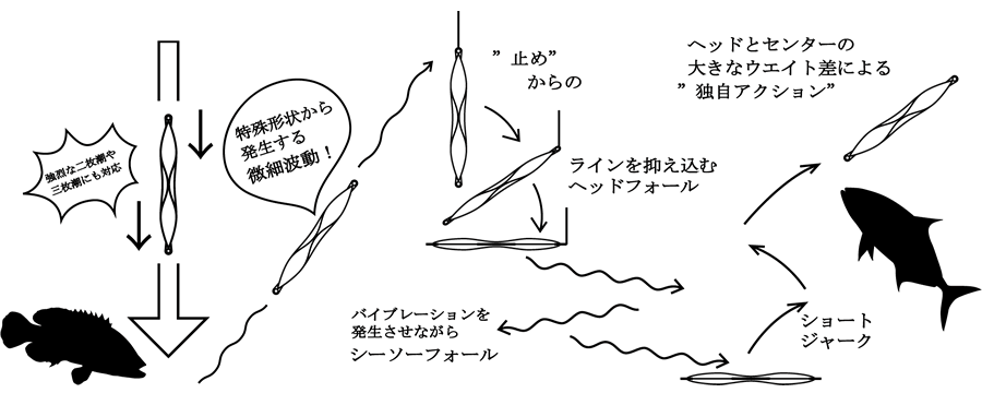 上記のようなヘビーセッティングでもディープゾーンで横向きアクションが可能となれば、もちろんアカムツ狙いのライトセッティングではさらに動きが良くなり、クロムツ、アラ等の中深海ターゲットにおいても抜群の釣果で開発スタッフを納得させた。また、横向きアクションだけではなく、その独自のシルエットから出る波動はゆっくりとアップさせるだけでも強力に水を押してターゲットにアピール。視界の利かない深海では他のジグにないアドバンテージを手に入れた。