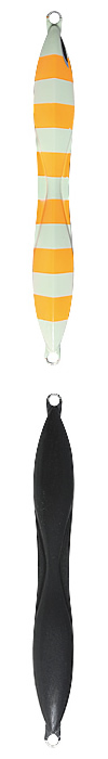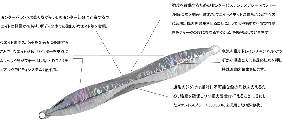 いかにジグをディープゾーンで横向きアクションさせることができるか。REALSが2年の開発期間を経て出した答えが、「究極のウエイト配分」であった。100mより浅いゾーンでは“ジグを飛ばして横を向ける”ことは可能だが、150m、200m、250m・・・深くなるほどにアップアクションでの横向き姿勢は困難に。潮の流れを受けている数百mものラインはジグに対して常に上へ引っ張るチカラを働かせている。つまり、ジグのラインアイには常時水面方向へのベクトルが効いているため、そう簡単にはジグが横を向かないのだ。そこで、この上方へのチカラをしっかりと抑え込み、フリーフォールさせるだけでヘッド部をおじぎさせるにはセンター部とのウエイト差が必要であることを発見。さらに安定した姿勢を維持するにはリア部のウエイトも必要となる。そのためにREALSが開発したD.G.S.(デュアルグラビティシステム:実用新案第3212440号)は意図的にウエイトが集中するスポットを離れた前後2ヶ所に設定。強度を確保しつつウエイトスポットを分離するにはREALS独自のC.P.S.(センタープレートシステム:実用新案第3192230号)無くしては不可能であり、極限までセンター部分のウエイトをカット。センターバランス・センター重心でありながら、そのセンター部のウエイトは極小という唯一無二のセンターバランス・スローピッチ専用セミロングジグ『Spec-ZERO』(意匠登録第1587533号)がついに完成。